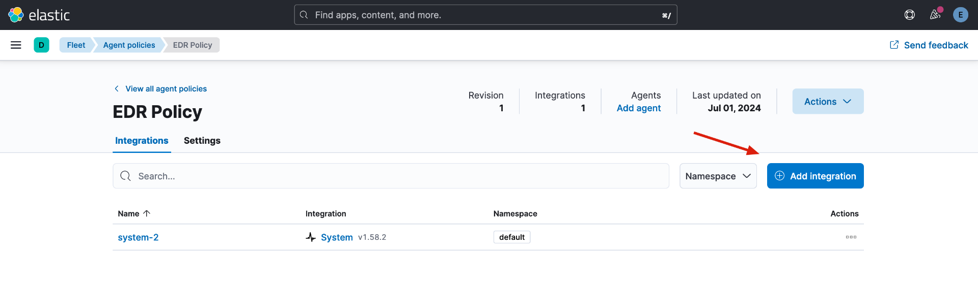 Para o correto monitoramento e encaminhamento de logs e alertas vamos configurar a integração com o o Elastic Defend para o Fleet Server
