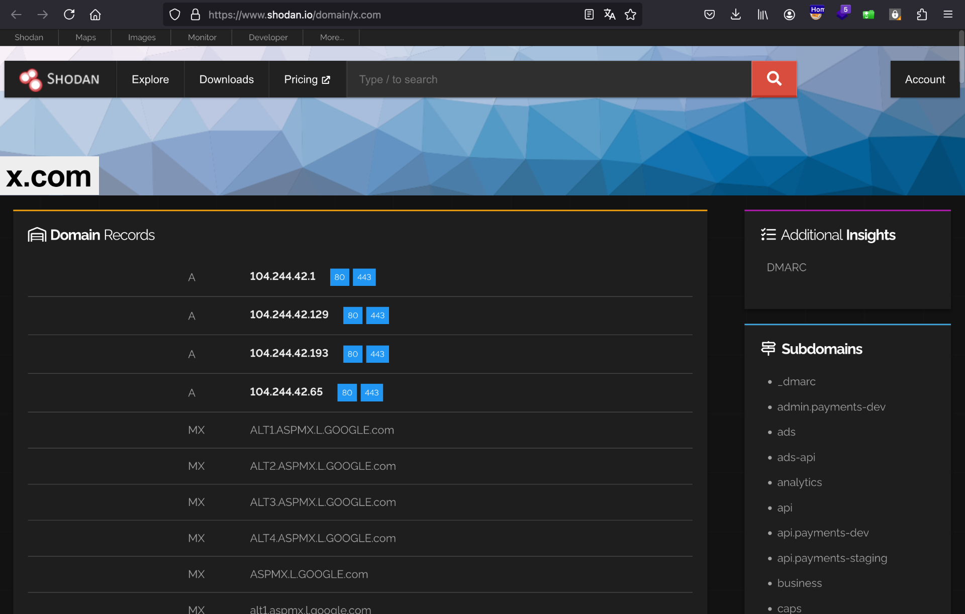 View all the addresses listed by Shodan through the URL https://www.shodan.io/domain/{DOMAIN}, replacing {DOMAIN} with the desired domain. Example: https://www.shodan.io/domain/x.com