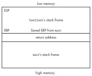 Note que temos o ESP no topo da pilha, a pilha (que neste caso terá o conteúdo que foi passado para a função) depois a base da pilha (EBP) e por fim o endereço de retorno (EIP), que neste ambiente será o endereço de memória da linha 12 da nossa aplicação, ou seja, o endereço que será utilizado pela nossa aplicação depois que a function1 fizer todo o seu trabalho e a aplicação precisa seguir o fluxo de execução.